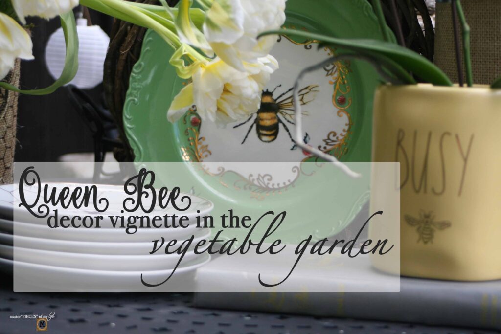The United Nations designated May 20th as World Bee day. I kicked off the month honoring these great creatures {honoring the iconic bee symbol}. Today I am sharing a queen bee decor vignette in the vegetable garden to keep promoting the bee awareness.