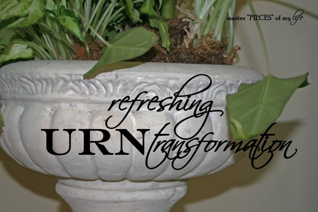 The urn is made out of resin but with the gray paint job it now looks more like concrete | cement.  Old garden statuary and antique relics always speak to me, which is the look I was going for.