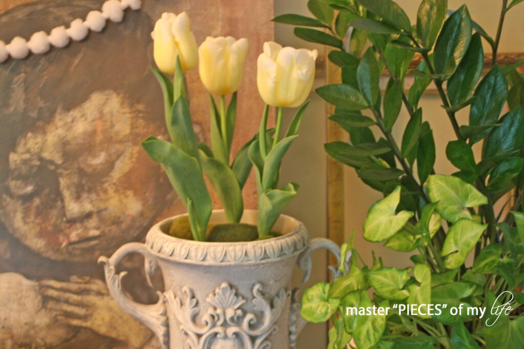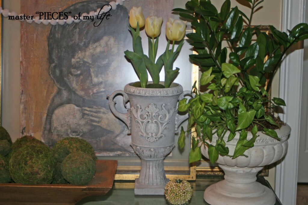 I love how these full of Spring tulips look in the urn. Actually that’s what prompted me to get this project done.  These tulips practically jumped into my cart during some regular grocery shopping the other day. I had to bring them home.  I wasn’t looking for them but they found me none the less.
