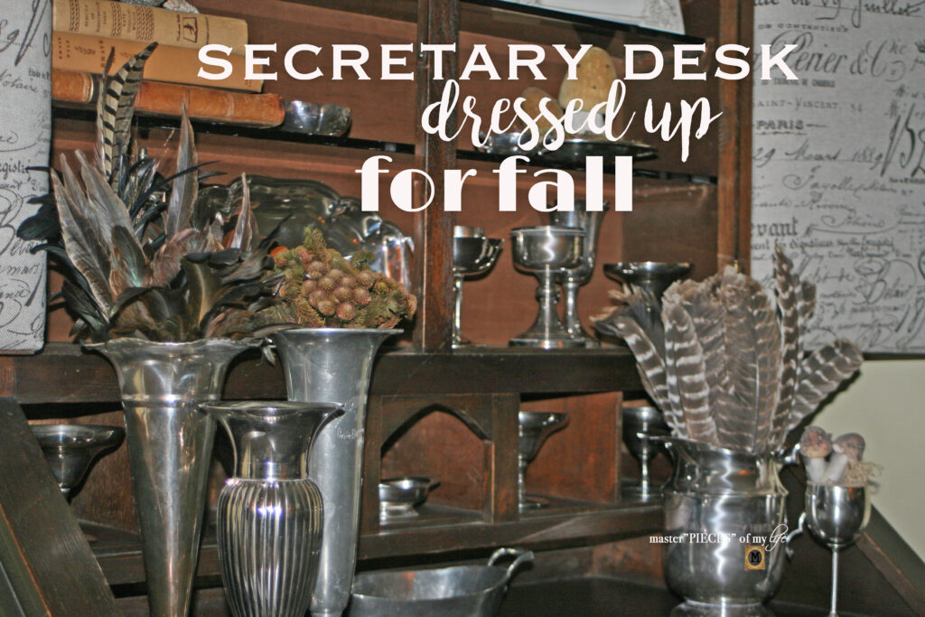 I have been sprinkling Fall fairy dust around the house and I wanted to share today my parent’s antique secretary desk dressed up for Autumn. For other Fall feels around here, I also recently shared my Fall rustic mantel and before that I shared my early Fall foyer. For the secretary desk I used three main components: silverplate, feathers, and mushrooms.