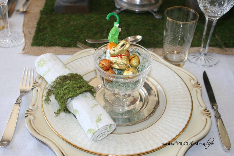 Like I mentioned about the napkin coordinates with the placemat in a subtle way. The moss napkin rings are another DIY, which coordinate with the bunnies and plate chargers. I included the fork inside the napkin ring for placement purposes. When the fork is placed next to the plate, as it should be, and the napkin next to it, the spacing seemed off. By placing the fork within the napkin it alleviated this problem. Don’t be afraid to break conventions and make your own rules.