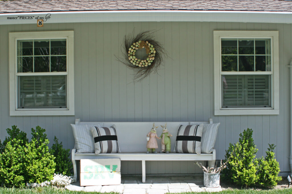 The little landing where the church pew sits is always a great focal point and we like to dress it up for the seasons. I added an Easter egg wreath to the grapevine form, replacing the reindeer moss from this project {a reindeer moss wreath}. When Easter passes I will put back the reindeer moss. My bunny couple add a touch of whimsy. If you’re interested here’s the story about {the church pew bench}.