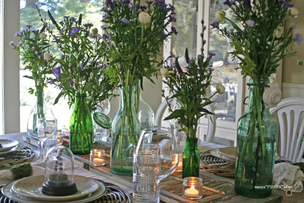 Mary Jo, Your table for springtime is so lovely. The green bottles are perfect for this time of year and filled with blooms that give the hint of the coming season. I love when you use that shutter, that is a great base for centerpieces! Wishing you a happy spring and pretty tables!