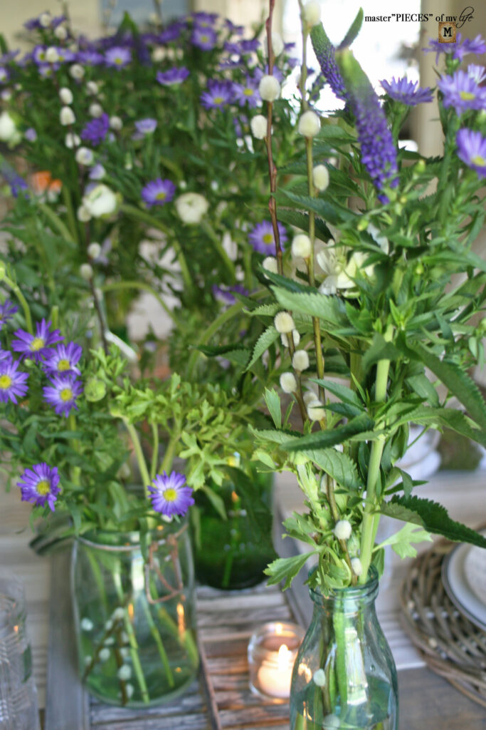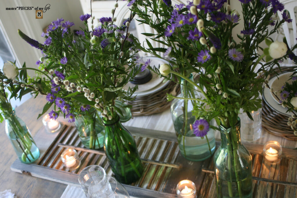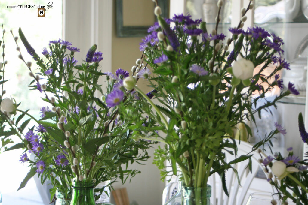 I wanted to use my green bottle collection, which you can read about here {through the season~green bottle collection}. The bottles sits haphazardly on the {chippy shutter centerpiece}, filled with pretty blooms.