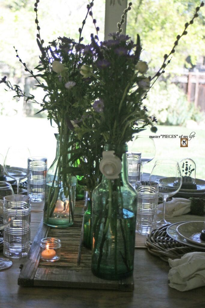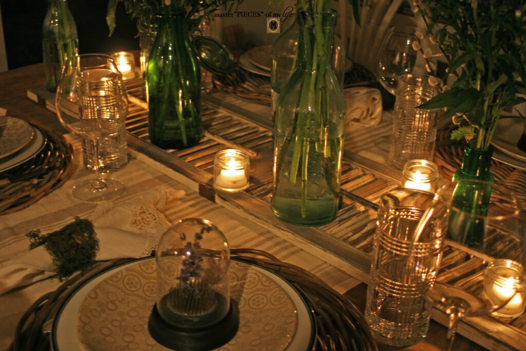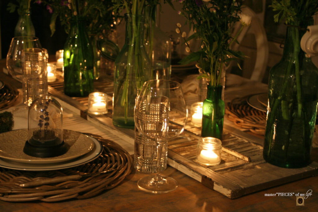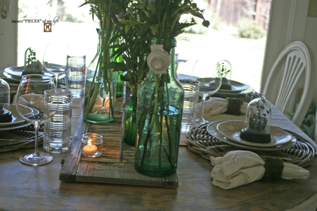 Your tablescape looks impressive. Green bottles and the cloche add a touch of elegance to the table.
