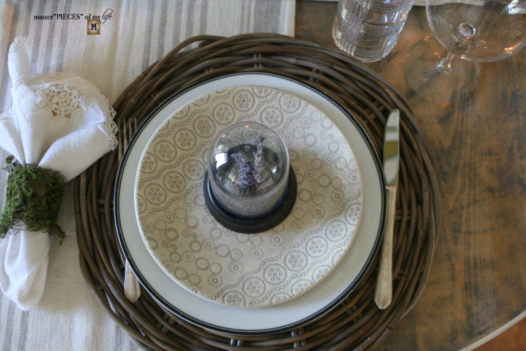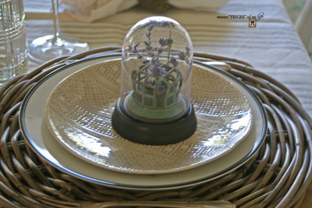 Underneath each mini cloche with lavender sprigs and floral frogs there’s a Wonki Ware assorted accent plate which you can read all about here {my latest dish obsession}, plus a William-Sonoma black trimmed bistro plate, which all sit atop wicker chargers from the old Pier1.