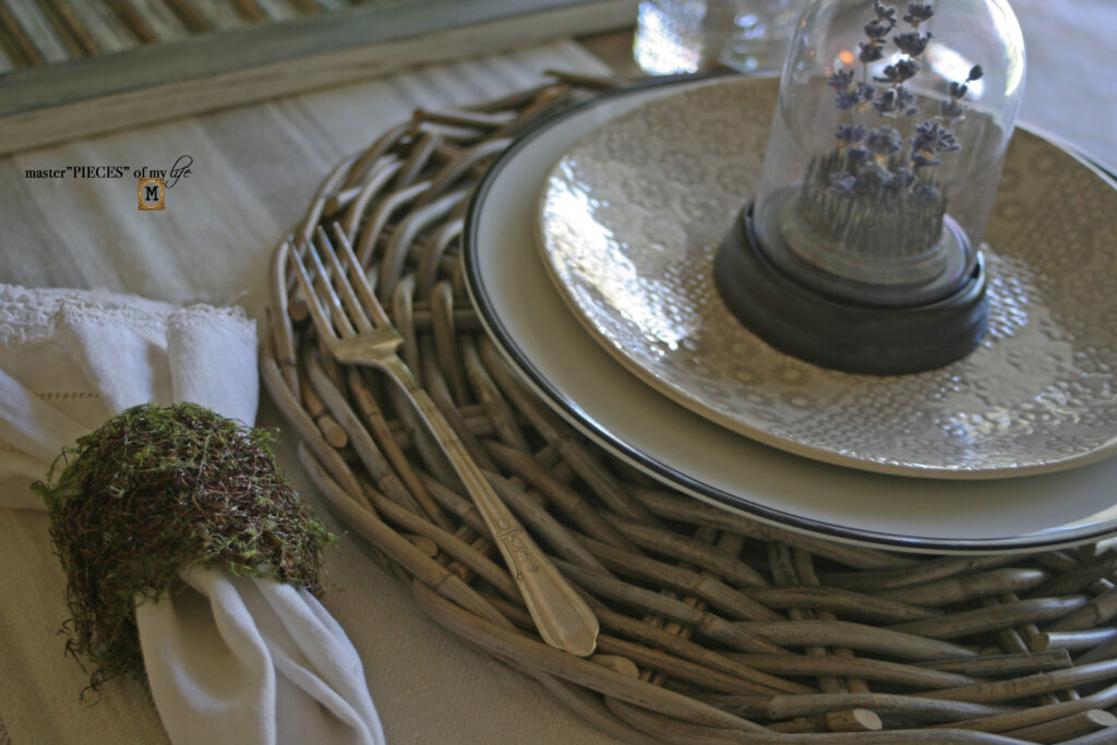The napkins are vintage linens from my parents, which I unearthed when I organized my linen closet {linens closet organization}. I wrapped the pretty napkins with the moss napkin rings, which you you can learn how to make here {eye-catching ways to add moss to your tabletop}.