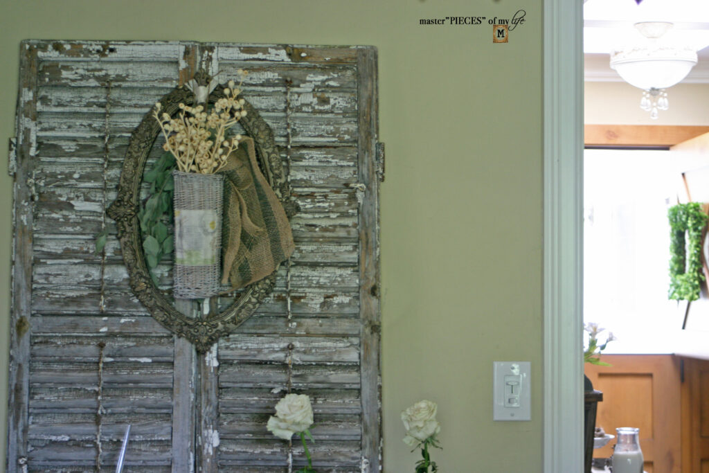 Once I had the basket assembled with the design updates and blooms, I added a burlap ribbon with green accents on one side for added interest. By using a piece of twine, the basket hangs off of the frame. It makes me super happy.