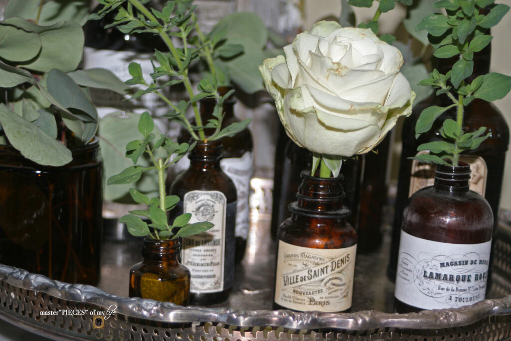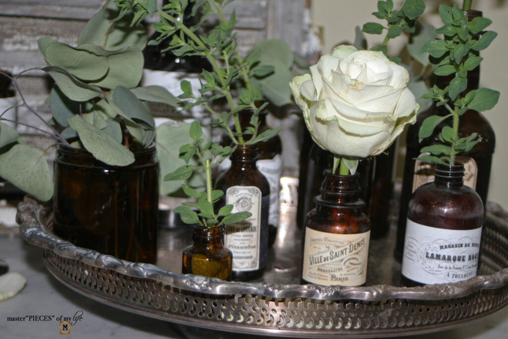 The flowers are from my Mother’s Day bouquet, which Miss M created for me, plus some eucalyptus left over from this project {Breakfast at Tiffany’s brunch tablescape}. I try to repurpose and use fresh blooms around our home as much as possible, which you can read about here {stretching grocery store flowers}. I also added a few sprigs of oregano form the veggie garden. They smell so good!