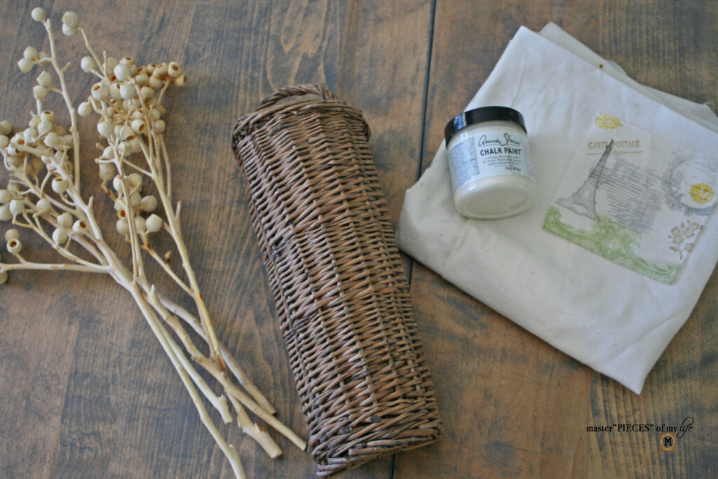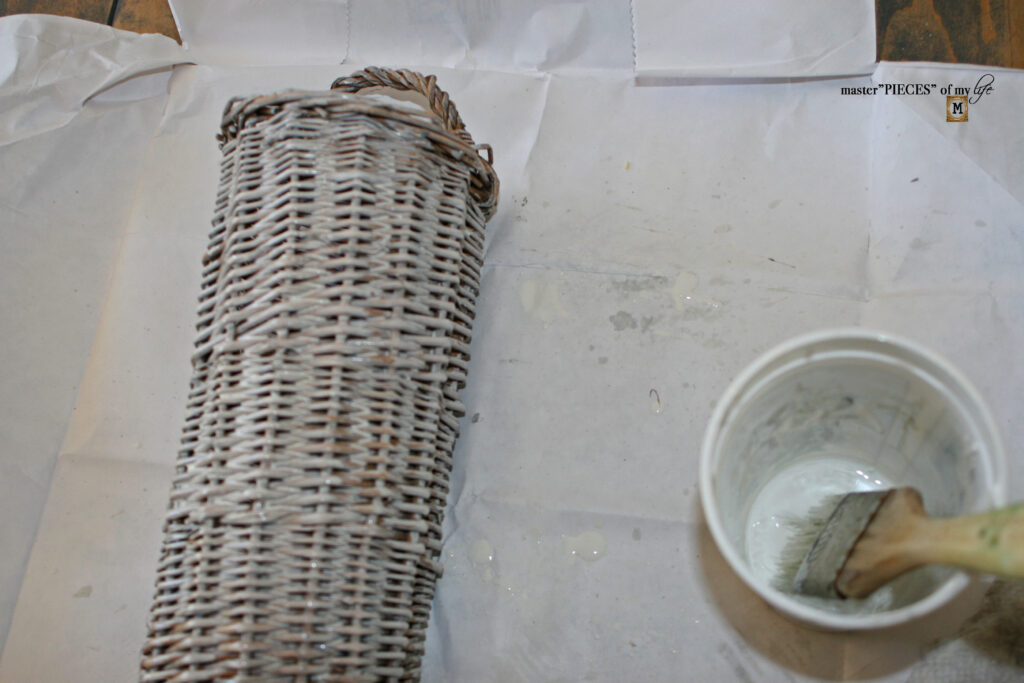 I used a quick white wash technique to soften the color of the basket. By using watered down chalk paint, it creates a soft wash that lightly coats the basket. I used Annie Sloane’s Old White chalk paint with a 50-50 ration of paint to water.