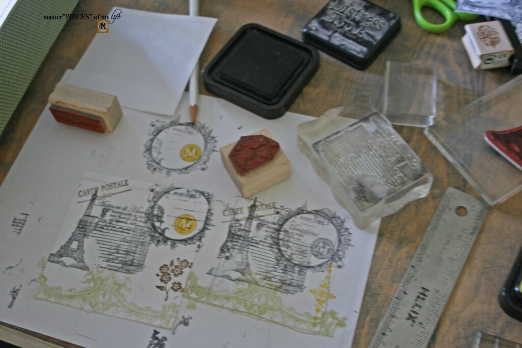 Then I created a decorative fabric patch to attach to the basket to give it a bit more personality. I used a variety of stamps on some upholstery lining fabric I had left over from another project. When you are stamping for a project I always recommend stamping your design on a scrap piece of paper first, in order to achieve the proper composition and pressure.