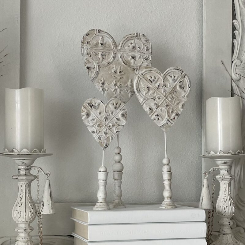 Also hearts don’t have to be red or pink. Personally I don’t use a ton of pink and | or red in my home decor, but mercury glass always calls to me. A few years ago I bought mercury glass ornaments after the Christmas holiday, which were deeply discounted. And although they have never graced our Christmas tree, I have used them for Valentine’s Day most years.