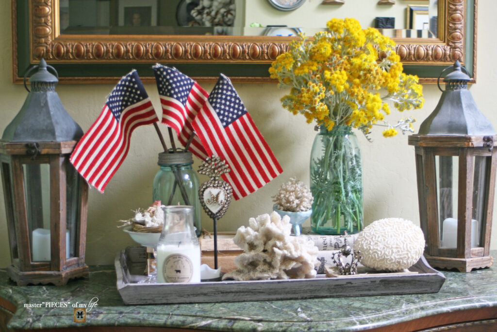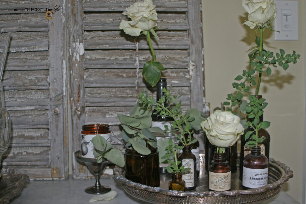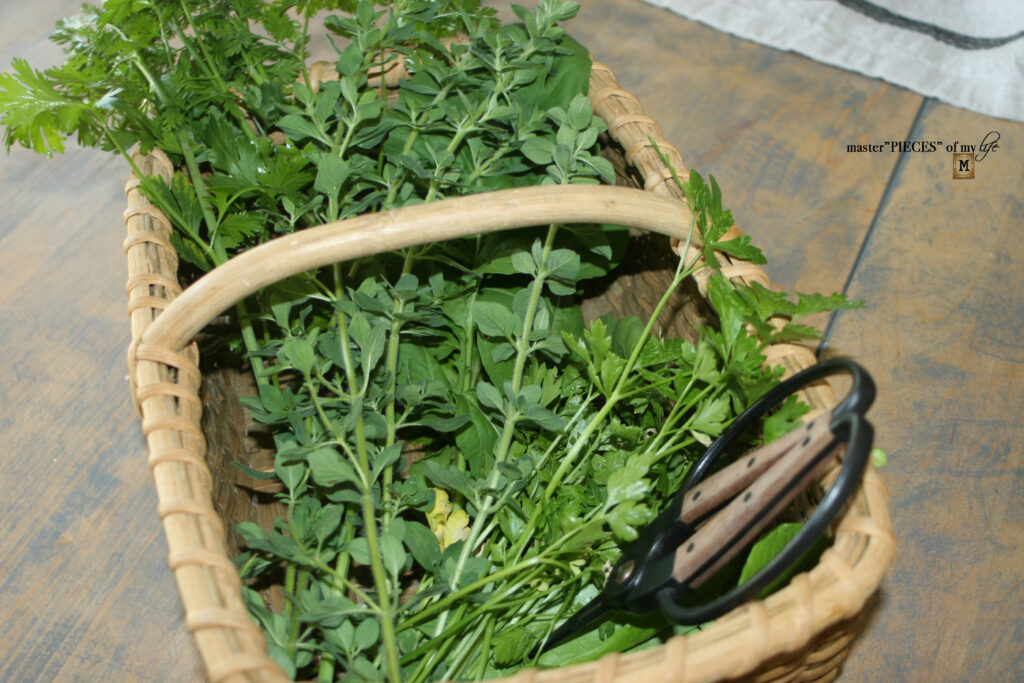 I also enjoy using herbs in arrangements since there is so much we cannot eat all of it fast enough. ?. I used oregano in this vignette and it smelled so good in the dining room {springing into summer with a frame wreath}.