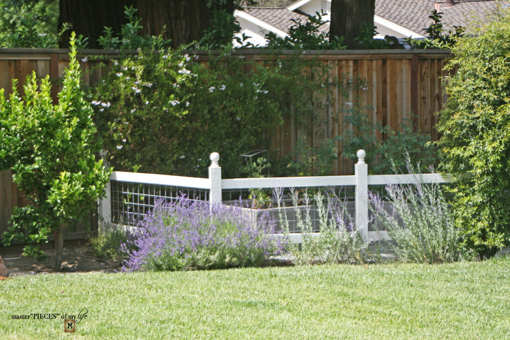 We have lavender plants flanking both sides of the veggie garden and in between in front of the fence we have Russian sage, which compliments the lavender nicely. We initially had all lavender plants but the amount of bees with that many plants made it difficult to tend to the veggie garden. This is how the veggie garden looked in the spring when we planted it.