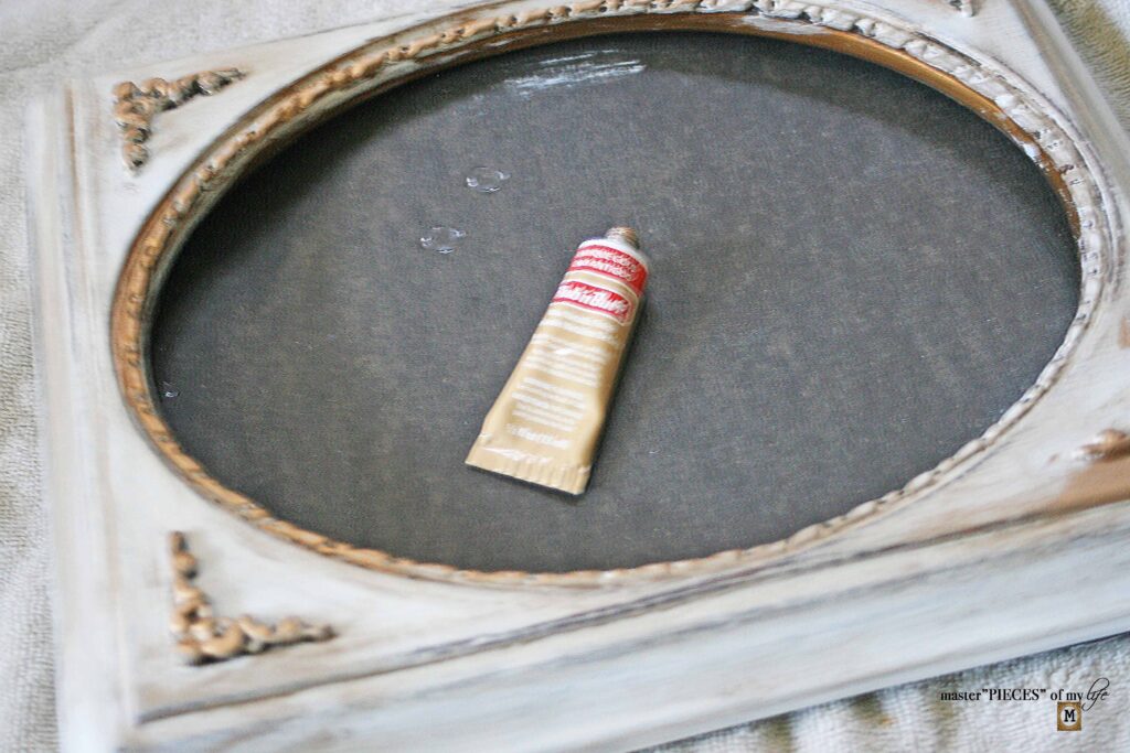 Seven: Once the wax is set, apply gilding medium to all the relief details of the frame. I applied Antique Gold Rub-n-Buff to the scroll flourishes on the corners and the inner oval, decorative edge.
