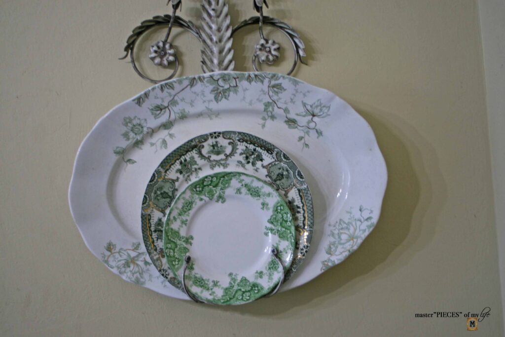 7. I’m glad you collect green transferware caz I collect blue! Actually, if I had more space, I would collect it ALL! Two years ago, I removed my dusty basket collection from the soffit over my kitchen cabinets and hung my blue and white plate collection–a motley bunch of souvenir plates (to places I’ve been, but thrifted the plates) to Blue Willow type designs to a birthday plate! I smile every time I think to look up at it! I found a large platter with forget me nots and hot glued (in just dots) a Dollar Tree galvanized tin “Thankful” to it; it hangs on a cupboard door.