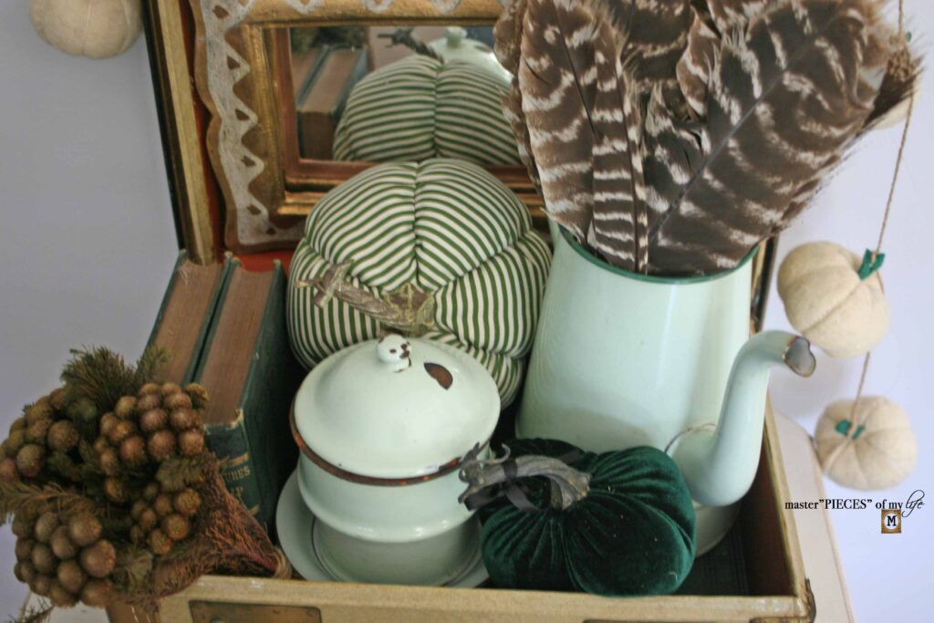 This is STUNNING!!! Isn’t Lora just amazing?! I’m constantly inspired by her as well!!! First of all, I too collect enamelware and that pot you used is gorgeous. It looks SO pretty with all those feathers! Second, when are velvet pumpkins not a great idea?! Third, that vintage suitcase is perfect for all of those vintage decor pieces. It’s just lovely, MaryJo!!