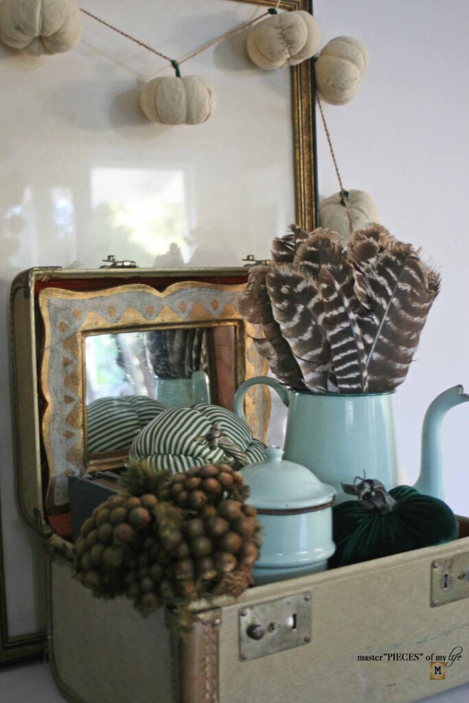 A green velvet pumpkin and a striped green pumpkin are tucked in because, uhh, it’s the season of the pumpkin. A photo frame in the background adds interest and frames (no pun intended) the lid of the suitcase.