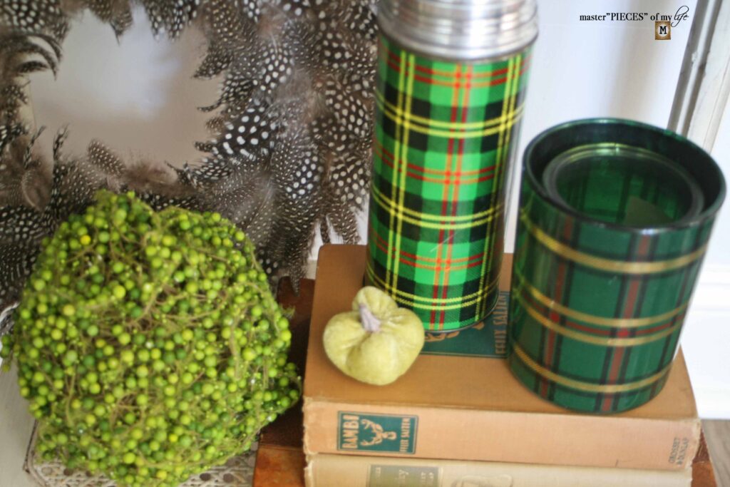 The vintage plaid thermos I thought tied in nicely with the coffee pot theme. And of course the plaid candle holder compliments the thermos. Plaids, tartans, etc. always catch my eye. Plus add the green color palette, and I am smitten. Vintage books are great risers plus add more texture and interest.
