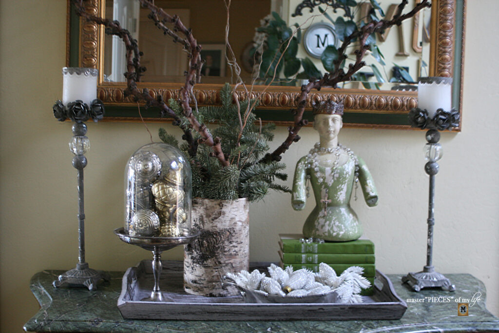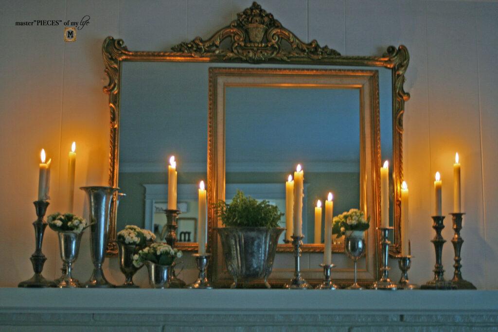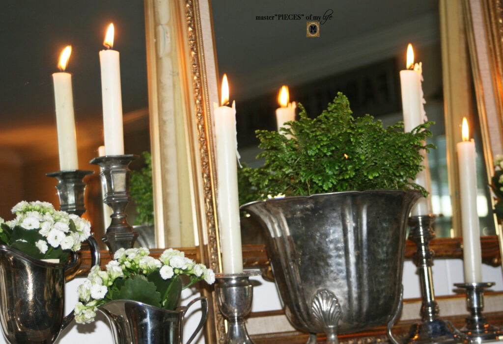 Everything looks lovely! My favorites are the forced paper-white bulbs as well as the vintage silver pieces and the candles on the mantelpiece. The overall effect is one of grace and elegance.