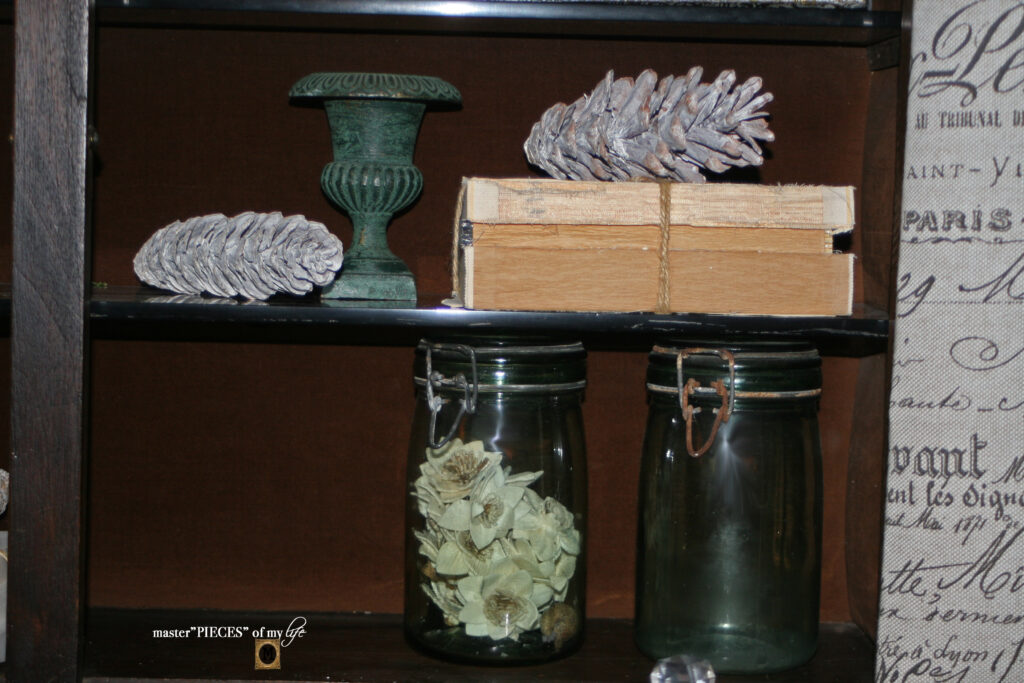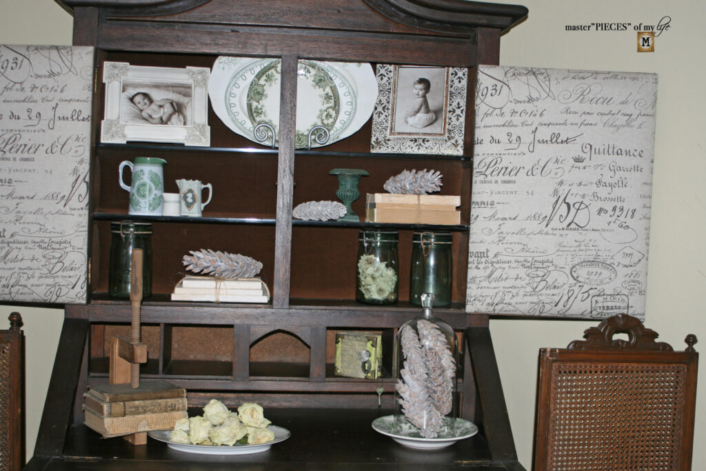 On the other side of the living room sits my mother’s antique secretary desk. The antique desk displays some green transfer ware and hotel ware along with green French canning jars among vintage books.