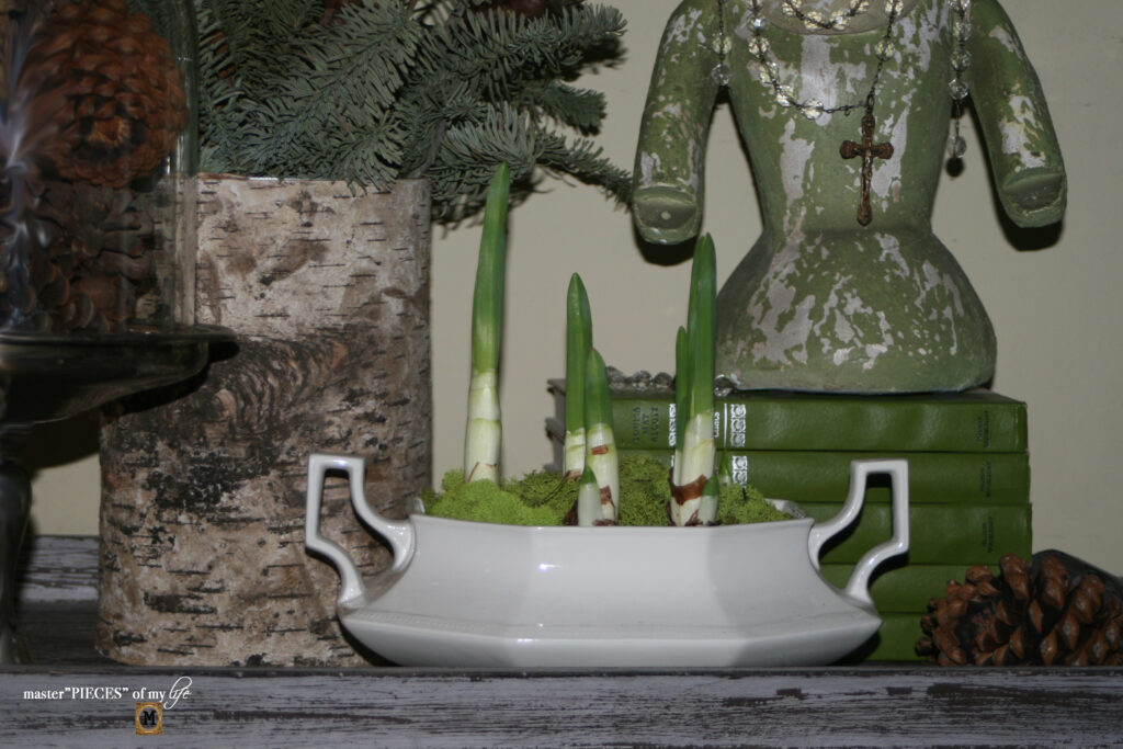 I simply swapped out the ornaments with pine cones, and I replaced the Christmas light glitter ornaments with my paper whites, which I am patiently waiting for them to do their thang. I love forcing bulbs. Although this is the only container I planted this season, you can read more on the topic here {forcing bulbs inside & more}.